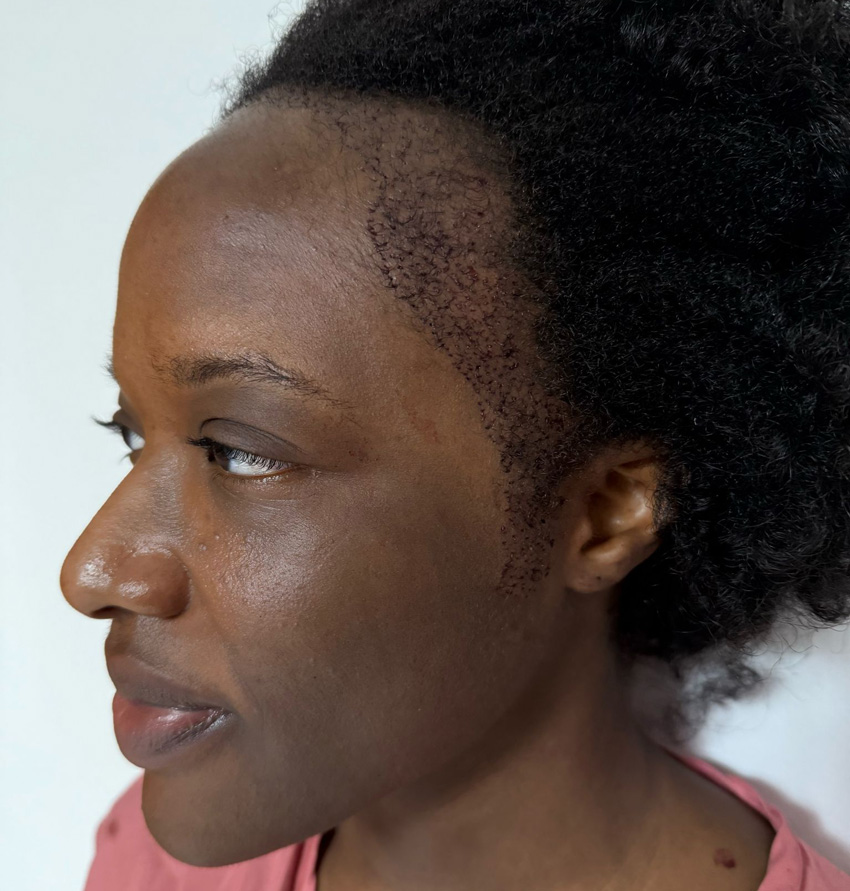 After hair transplant surgery, patients can expect mild swelling, redness, and tenderness in the donor area and recipient areas. These symptoms are temporary and usually subside within a few days. Small scabs will form around the transplanted hair grafts, which naturally fall off within 7-10 days.
