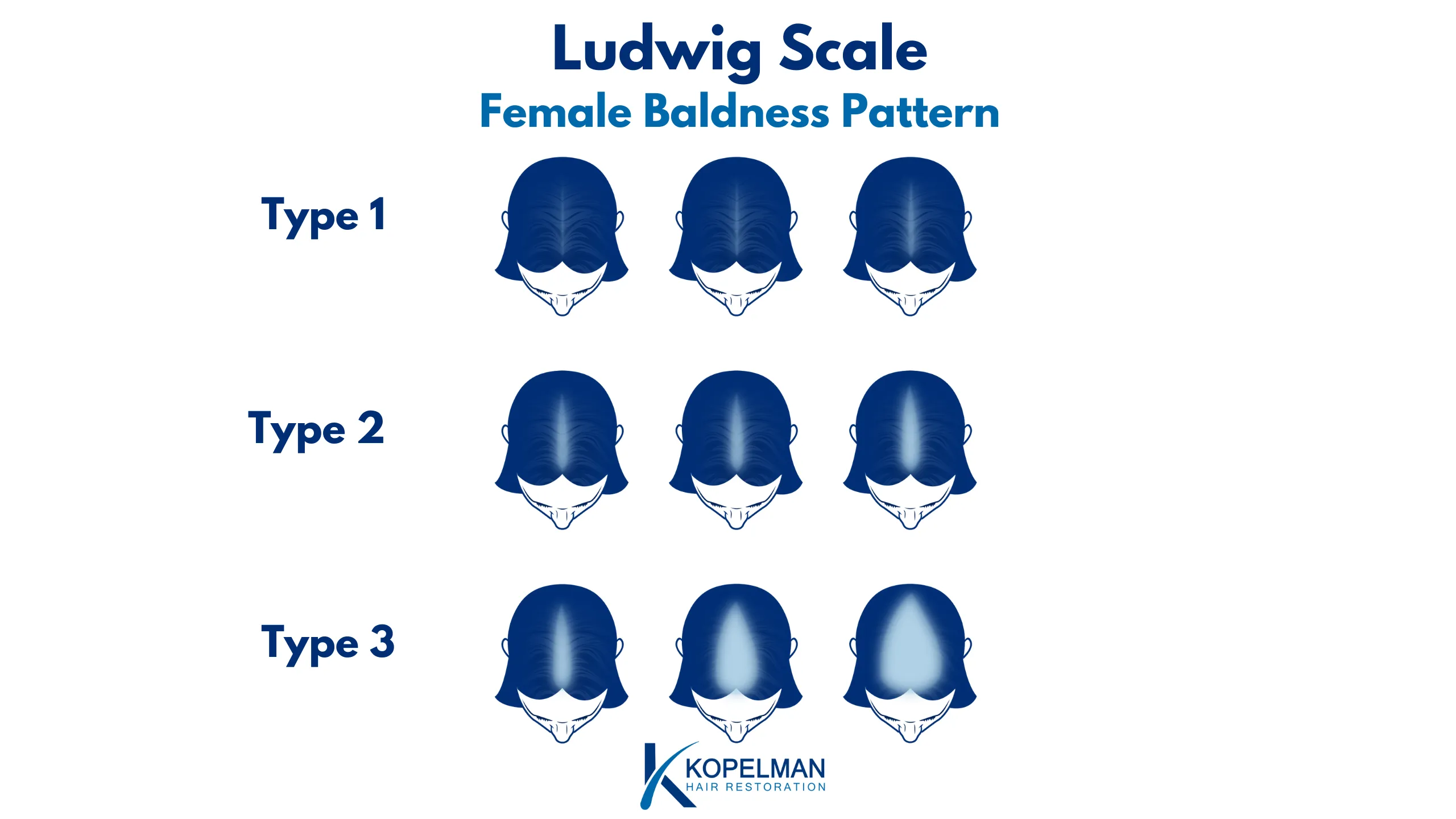 The Ludwig Scale is commonly used to classify female pattern hair loss. It ranges from mild thinning at the crown (Type I) to more extensive hair loss (Type III), helping specialists assess severity and treatment options.